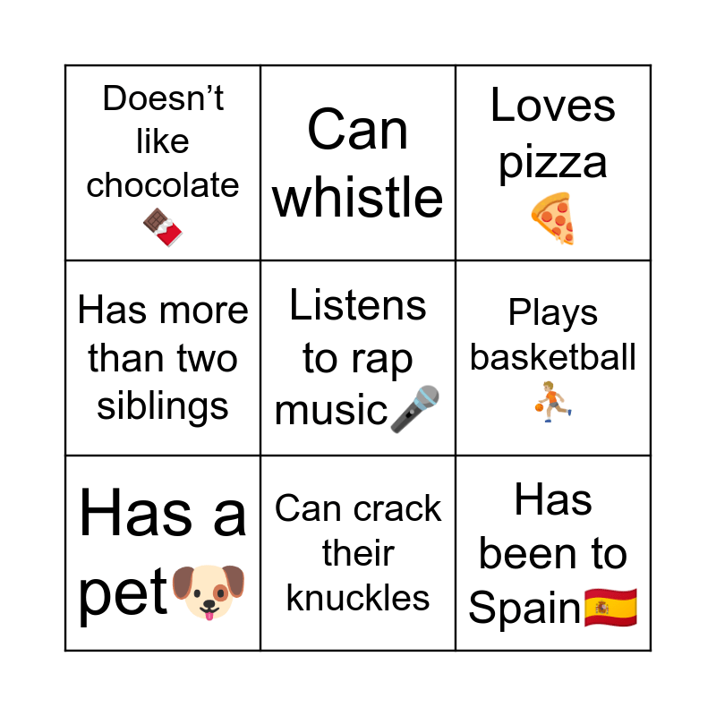 This bingo card has 9 words: Has a pet🐶, Loves pizza🍕, Can whistle, Has more than two siblings, Doesn’t like chocolate🍫, Plays basketball⛹🏼, Listens to rap music🎤, Has been to Spain🇪🇸 and Can crack their knuckles.