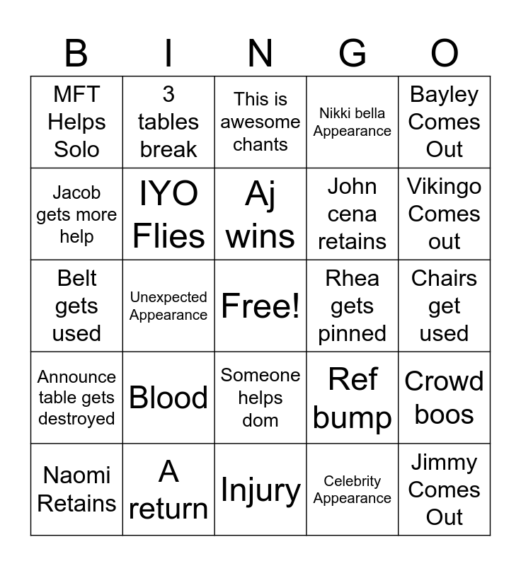 This bingo card has a free space and 24 words: Blood, A return, Aj wins, Naomi Retains, Bayley Comes Out, MFT Helps Solo, Jacob gets more help, 3 tables break, Rhea gets pinned, Someone helps dom, John cena retains, Belt gets used, Ref bump, Crowd boos, IYO Flies, Celebrity Appearance, Chairs get used, This is awesome chants, Vikingo Comes out, Unexpected Appearance, Jimmy Comes Out, Announce table gets destroyed, Nikki bella Appearance and Injury.