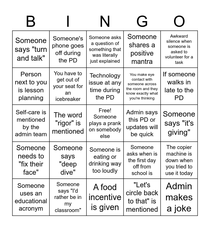 This bingo card has a free space and 24 words: Someone says "deep dive", Someone says "I'd rather be in my classroom", Technology issue at any time during the PD, Someone uses an educational acronym, Awkward silence when someone is asked to volunteer for a task, Someone says "turn and talk", Person next to you is lesson planning, Someone's phone goes off during the PD, Admin says this PD or updates will be quick, Someone is eating or drinking way too loudly, You make eye contact with someone across the room and they know exactly what you're thinking, Self-care is mentioned by the admin team, Someone asks when is the first day off from school is, The copier machine is down when you tried to use it today, You have to get out of your seat for an icebreaker, "Let's circle back to that" is mentioned, Someone says "it's giving", Someone asks a question of something that was literally just explained, If someone walks in late to the PD, The word "rigor" is mentioned, Admin makes a joke, Someone needs to "fix their face", Someone shares a positive mantra and A food incentive is given.