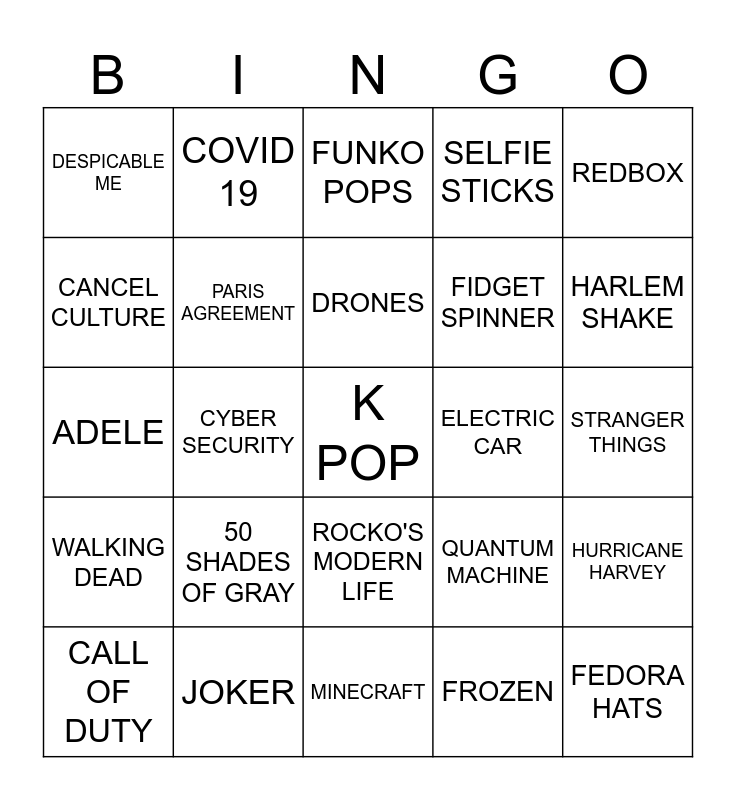 This bingo card has 52 words: Free!, K POP, AVENGERS, MINECRAFT, 50 SHADES OF GRAY, DRAKE, COVID 19, 4G BROADBAND, CANCEL CULTURE, INSTAGRAM, PARIS AGREEMENT, AFFORDABLE CARE ACT, HURRICANE HARVEY, QUANTUM MACHINE, APPLE, ANDROID, DRONES, ELECTRIC CAR, 3D PRINTER, REDBOX, CYBER SECURITY, FROZEN, DESPICABLE ME, FIDGET SPINNER, iPAD, FEDORA HATS, POKEMON GO, VIRTUAL REALITY, HARLEM SHAKE, EMOJIS, ANGRY BIRDS, SELFIE STICKS, BEATS HEADPHONES, SMART WATCHES, LADY GAGA, FUNKO POPS, JOKER, HARRY POTTER & THE DEATHLY HALLOWS, JUSTICE LEAGUE, JURASSIC WORLD, LEGO MOVIE, STRANGER THINGS, WALKING DEAD, GAME OF THRONES, ROCKO'S MODERN LIFE, BUBBLE GUPPIES, BRUNO MARS, ADELE, SUPER MARIO ODYSSEY, CANDY CRUSH, CALL OF DUTY and STEPHEN CURRY.