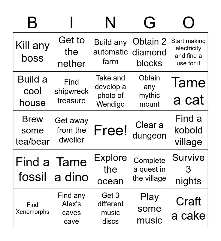 This bingo card has a free space and 24 words: Tame a dino, Find any Alex's caves cave, Take and develop a photo of Wendigo, Find Xenomorphs, Start making electricity and find a use for it, Kill any boss, Build a cool house, Get to the nether, Clear a dungeon, Explore the ocean, Obtain any mythic mount, Brew some tea/bear, Complete a quest in the village, Survive 3 nights, Find shipwreck treasure, Play some music, Find a kobold village, Build any automatic farm, Tame a cat, Get away from the dweller, Craft a cake, Find a fossil, Obtain 2 diamond blocks and Get 3 different music discs.