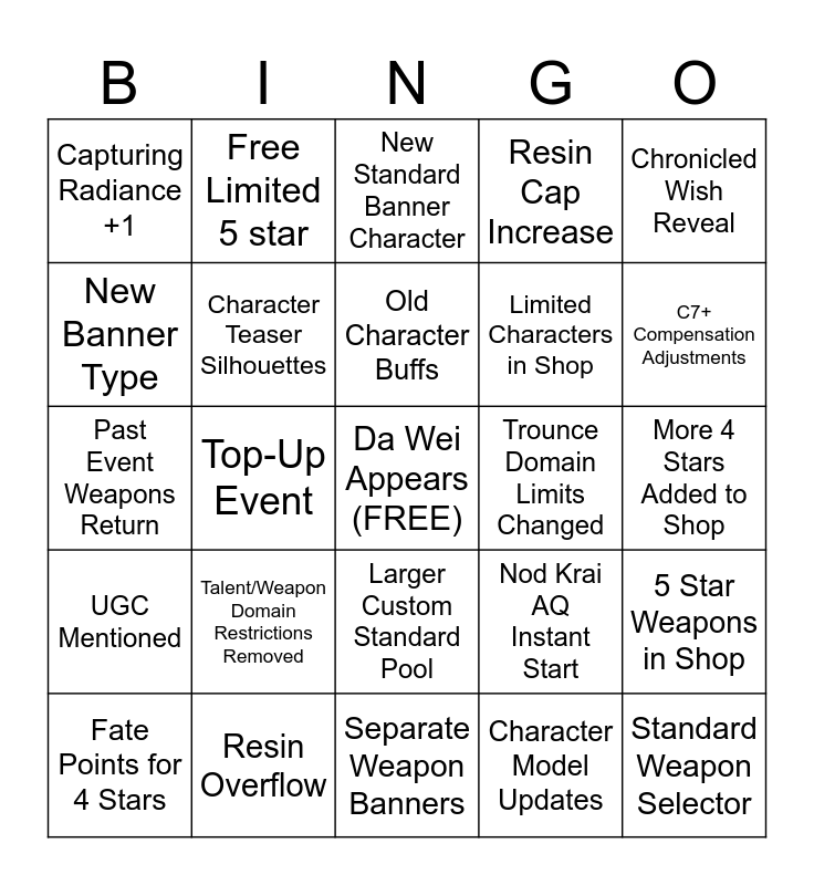 This bingo card has a free space and 24 words: Talent/Weapon Domain Restrictions Removed, Resin Overflow, Old Character Buffs, Fate Points for 4 Stars, Chronicled Wish Reveal, Capturing Radiance +1, New Banner Type, Free Limited 5 star, Trounce Domain Limits Changed, Larger Custom Standard Pool, Limited Characters in Shop, Past Event Weapons Return, Nod Krai AQ Instant Start, 5 Star Weapons in Shop, Character Teaser Silhouettes, Character Model Updates, More 4 Stars Added to Shop, New Standard Banner Character, C7+ Compensation Adjustments, Top-Up Event, Standard Weapon Selector, UGC Mentioned, Resin Cap Increase and Separate Weapon Banners.