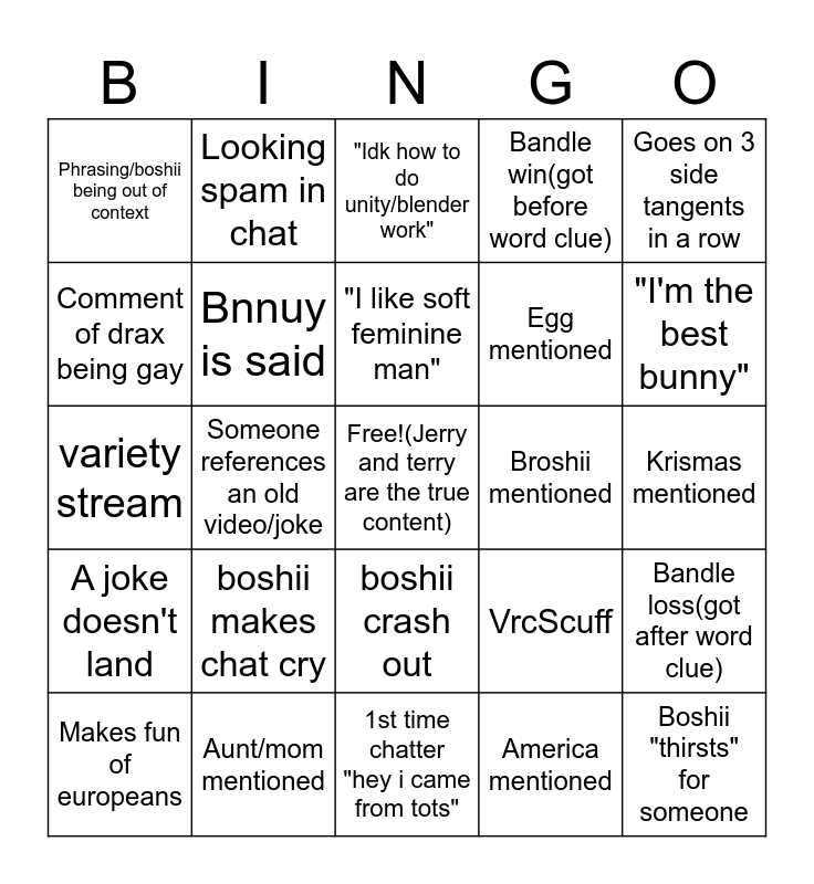 This bingo card has a free space and 51 words: Sisters mentioned, Boshii "thirsts" for someone, "Excuse me sir/maam", 1st time chatter "hey i came from tots", boshii makes chat cry, Boshii is assaulted, Looking spam in chat, Purple cats mentioned, Comment of drax being gay, Mods do the thing (no mods do it), Bnnuy is said, Bandle win(got before word clue), Bandle loss(got after word clue), VrcScuff, Boshii is bullyed by someone in world, "Im not gay", "I like soft feminine man", Broshii mentioned, Buppy mentioned, Goes on 3 side tangents in a row, Someone references an old video/joke, America mentioned, Phrasing/boshii being out of context, Egg mentioned, Unscripted toast mentioned, WWE mentioned, "I'm the best bunny", Cringe 1st time chatter, Makes fun of europeans, "Idk how to do unity/blender work", Someone makes a clip or edit to make fun of boshii, "Hates me", "Ofc kaiju shows up now", Flustered boshii, Incest mentioned, Aunt/mom mentioned, "Big Cat", Boshii singing, Jschlatt mentioned, Jerma mentioned, Krismas mentioned, A joke doesn't land, Dad joke/pun, The boshii pose, Boshii does the vrc default emotes, vrc stream, variety stream, react andy, makes an accent/funny voice, boshii crash out and "i dont play video games/watch movies".