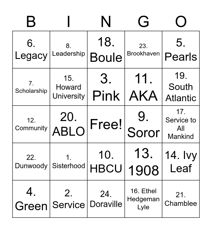 This bingo card has a free space and 24 words: 1. Sisterhood, 2. Service, 3. Pink, 4. Green, 5. Pearls, 6. Legacy, 7. Scholarship, 8. Leadership, 9. Soror, 10. HBCU, 11. AKA, 12. Community, 13. 1908, 14. Ivy Leaf, 15. Howard University, 16. Ethel Hedgeman Lyle, 17. Service to All Mankind, 18. Boule, 19. South Atlantic, 20. ABLO, 21. Chamblee, 22. Dunwoody, 23. Brookhaven and 24. Doraville.