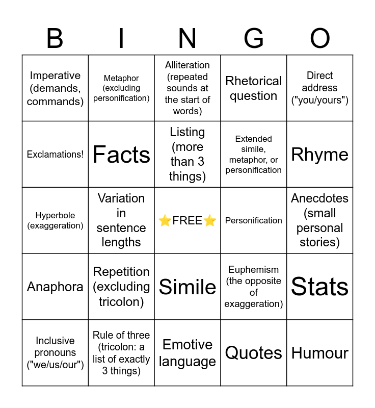This bingo card has a free space and 24 words: Repetition (excluding tricolon), Rule of three (tricolon: a list of exactly 3 things), Listing (more than 3 things), Inclusive pronouns ("we/us/our"), Direct address ("you/yours"), Imperative (demands, commands), Exclamations!, Metaphor (excluding personification), Personification, Simile, Extended simile, metaphor, or personification, Hyperbole (exaggeration), Euphemism (the opposite of exaggeration), Stats, Facts, Quotes, Anecdotes (small personal stories), Alliteration (repeated sounds at the start of words), Rhyme, Variation in sentence lengths, Humour, Anaphora, Rhetorical question and Emotive language.
