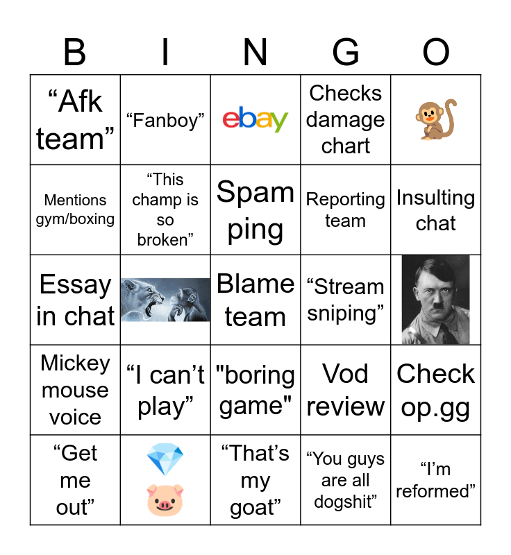 This bingo card has 3 images, a free space and 21 words: “I can’t play”, 💎🐷, Spam ping, “Get me out”, 🐒, “Afk team”, Mentions gym/boxing, “Fanboy”, “Stream sniping”, "boring game", Reporting team, Essay in chat, Vod review, Check op.gg, “This champ is so broken”, “You guys are all dogshit”, Insulting chat, “I’m reformed”, Mickey mouse voice, Checks damage chart and “That’s my goat”.