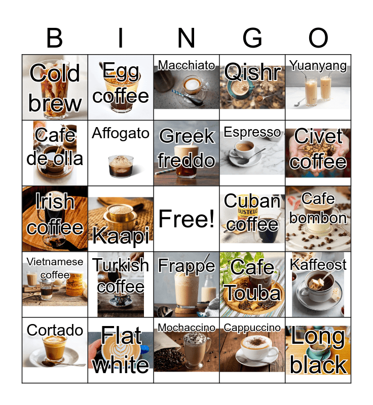 This bingo card has 24 images, a free space and 24 words: Turkish coffee, Flat white, Greek freddo, Cortado, Yuanyang, Cold brew, Cafe de olla, Egg coffee, Cuban coffee, Frappe, Espresso, Irish coffee, Cafe Touba, Kaffeost, Affogato, Cappuccino, Cafe bombon, Macchiato, Civet coffee, Kaapi, Long black, Vietnamese coffee, Qishr and Mochaccino.