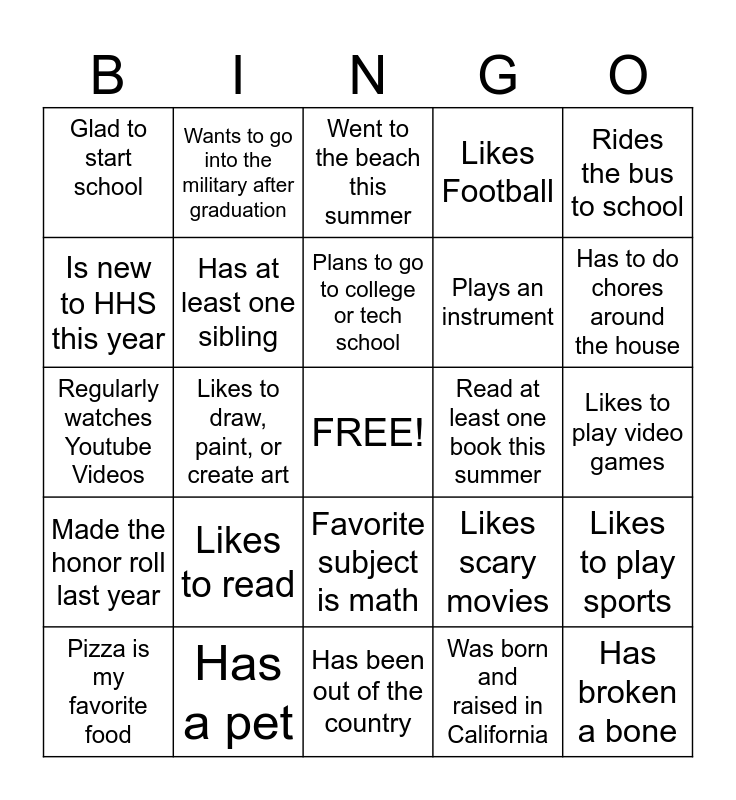 This bingo card has a free space and 24 words: Likes to read, Has a pet, Plans to go to college or tech school, Pizza is my favorite food, Rides the bus to school, Glad to start school, Is new to HHS this year, Wants to go into the military after graduation, Read at least one book this summer, Favorite subject is math, Plays an instrument, Regularly watches Youtube Videos, Likes scary movies, Likes to play sports, Has at least one sibling, Was born and raised in California, Likes to play video games, Went to the beach this summer, Has to do chores around the house, Likes to draw, paint, or create art, Has broken a bone, Made the honor roll last year, Likes Football and Has been out of the country.