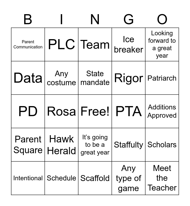 This bingo card has a free space and 27 words: Staffulty, Team building, Rigor, Scaffold, Data, Team, PLC, Parent Square, PTA, Scholars, PD, Ice breaker, Intentional, Schedule, Patriarch, Any obnoxious attention getting action, Any costume, State mandate, Hawk Herald, Parent Communication, Additions Approved, Any type of game, Rosa, Meet the Teacher, It’s going to be a great year, Looking forward to a great year and Educators.