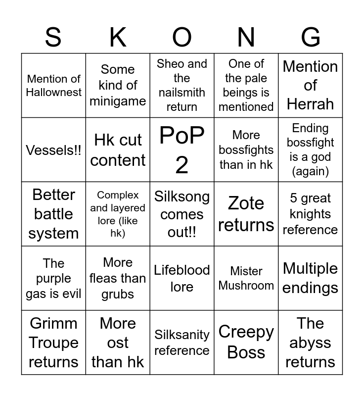 This bingo card has a free space and 24 words: More fleas than grubs, More ost than hk, PoP 2, Grimm Troupe returns, Mention of Herrah, Mention of Hallownest, Vessels!!, Some kind of minigame, Zote returns, Lifeblood lore, More bossfights than in hk, Better battle system, Mister Mushroom, Multiple endings, Hk cut content, Creepy Boss, 5 great knights reference, Sheo and the nailsmith return, Ending bossfight is a god (again), Complex and layered lore (like hk), The abyss returns, The purple gas is evil, One of the pale beings is mentioned and Silksanity reference.