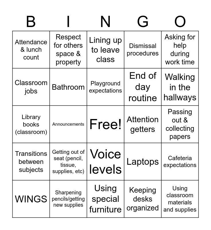 This bingo card has a free space and 29 words: WINGS, Entering the classroom, Announcements, Morning Routine, Attendance & lunch count, Lining up to leave class, Bathroom, Getting out of seat (pencil, tissue, supplies, etc), Attention getters, Sharpening pencils/getting new supplies, Passing out & collecting papers, Using classroom materials and supplies, Using special furniture, Keeping desks organized, Walking in the hallways, How to head papers, Voice levels, Transitions between subjects, Asking for help during work time, Library books (classroom), Laptops, Raising hand, End of day routine, Classroom jobs, Dismissal procedures, Respect for others space & property, Cafeteria expectations, Playground expectations and Specials.