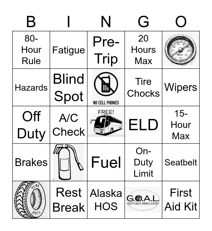 This bingo card has 5 images, a free space and 19 words: 80-Hour Rule, Fatigue, Pre-Trip, ELD, 15-Hour Max, Off Duty, Blind Spot, On-Duty Limit, Seatbelt, Hazards, Rest Break, Alaska HOS, 20 Hours Max, Wipers, Brakes, A/C Check, Fuel, Tire Chocks and First Aid Kit.