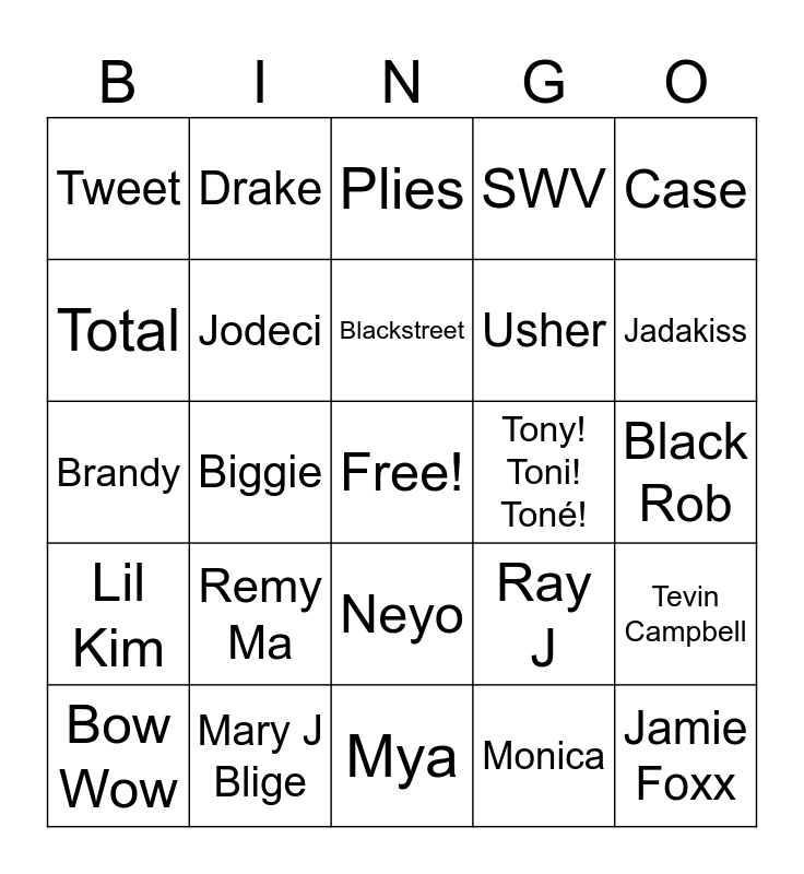 This bingo card has a free space and 24 words: Bow Wow, Remy Ma, Blackstreet, Monica, Case, Tweet, Drake, Plies, Tony! Toni! Toné!, Black Rob, Brandy, Jodeci, Ray J, Tevin Campbell, Total, Mary J Blige, Mya, SWV, Jadakiss, Lil Kim, Biggie, Neyo, Usher and Jamie Foxx.