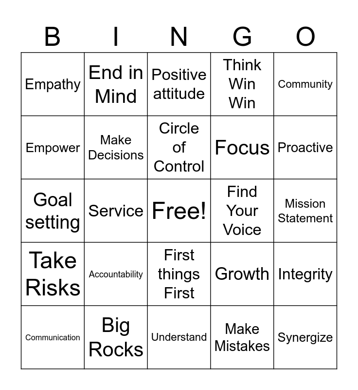 This bingo card has a free space and 24 words: Accountability, Big Rocks, Circle of Control, Communication, Community, Empathy, Empower, End in Mind, Find Your Voice, First things First, Focus, Goal setting, Growth, Integrity, Make Decisions, Make Mistakes, Mission Statement, Positive attitude, Proactive, Service, Synergize, Take Risks, Think Win Win and Understand.
