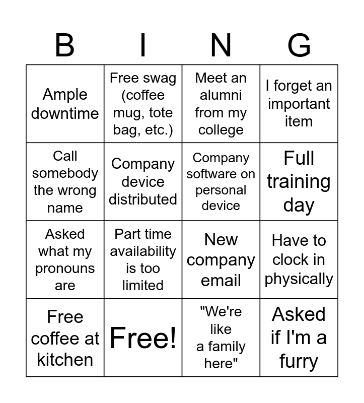 This bingo card has 25 words: Given a shirt w/Company logo, Free lunch provided, Full training day, Someone pries too much into personal life, Call somebody the wrong name, Ample downtime, Company device distributed, Free swag (coffee mug, tote bag, etc.), Free!, Company ID card doesn't work (yet), Asked what my pronouns are, New company email, Microsoft Teams/Outlook, Not the only new employee, Company software on personal device, Asked to do something out of my description, "We're like a family here", Meet an alumni from my college, Part time availability is too limited, Have to clock in physically, Free coffee at kitchen, No benefits due to intern status, Asked if I'm a furry, I forget an important item and Mistaken for being older than I am.