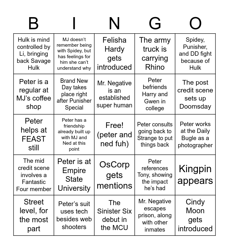 This bingo card has a free space and 24 words: Peter is at Empire State University, Peter’s suit uses tech besides web shooters, Mr. Negative is an established super human, Street level, for the most part, Spidey, Punisher, and DD fight because of Hulk, Hulk is mind controlled by Li, bringing back Savage Hulk, Peter is a regular at MJ’s coffee shop, MJ doesn’t remember being with Spidey, but has feelings for him she can’t understand why, Peter consults going back to Strange to put things back, OsCorp gets mentions, Peter befriends Harry and Gwen in college, Peter helps at FEAST still, Peter references Tony, showing the impact he’s had, Kingpin appears, Brand New Day takes place right after Punisher Special, Mr. Negative escapes prison, along with other inmates, Peter works at the Daily Bugle as a photographer, Felisha Hardy gets introduced, The post credit scene sets up Doomsday, Peter has a friendship already built up with MJ and Ned at this point, Cindy Moon gets introduced, The mid credit scene involves a Fantastic Four member, The army truck is carrying Rhino and The Sinister Six debut in the MCU.