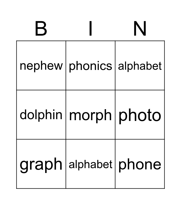 This bingo card has 9 words: graph, alphabet, phonics, dolphin, nephew, photo, morph, phone and alphabet.