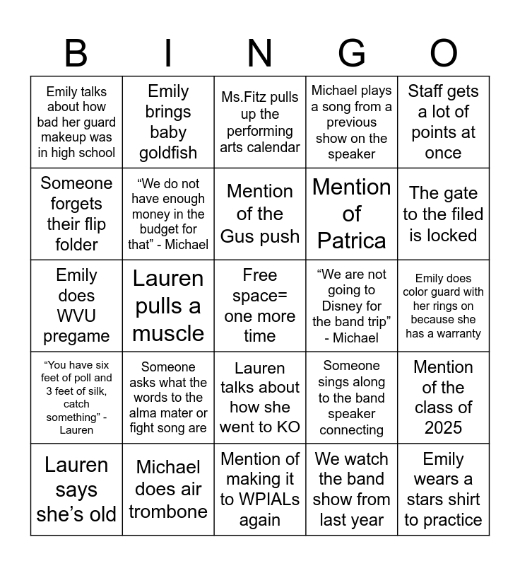 This bingo card has a free space and 24 words: Someone asks what the words to the alma mater or fight song are, Michael does air trombone, Mention of the Gus push, Lauren says she’s old, Staff gets a lot of points at once, Emily talks about how bad her guard makeup was in high school, Someone forgets their flip folder, Emily brings baby goldfish, “We are not going to Disney for the band trip” - Michael, Lauren talks about how she went to KO, Mention of Patrica, Emily does WVU pregame, Someone sings along to the band speaker connecting, Mention of the class of 2025, “We do not have enough money in the budget for that” - Michael, We watch the band show from last year, Emily does color guard with her rings on because she has a warranty, Ms.Fitz pulls up the performing arts calendar, The gate to the filed is locked, Lauren pulls a muscle, Emily wears a stars shirt to practice, “You have six feet of poll and 3 feet of silk, catch something” - Lauren, Michael plays a song from a previous show on the speaker and Mention of making it to WPIALs again.