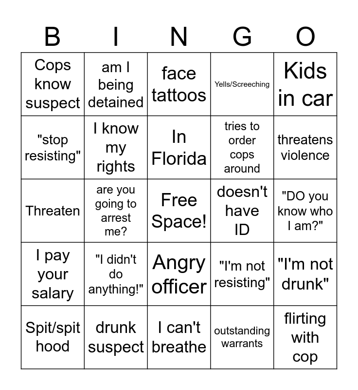 This bingo card has a free space and 52 words: Taser, flirting with cop, crazy chair, I can't breathe, "I didn't do anything!", tables ready, am I being detained, Don't touch me!, "stop resisting", cuffs too tight, I know my rights, only 2 beers, "I'm not drunk", "I'm not resisting", call your supervisor, runs from cop, In Florida, doesn't have ID, but I have kids, Kids in car, are you going to arrest me?, outstanding warrants, Cops know suspect, tries to order cops around, Assaults cop, Spit mask, pepper spray, cop closes door mid sentence, threatens violence, argue with cop, restraining order, Yells/Screeching, Fat Cop, Rap sheet, spits on officer, face tattoos, drunk suspect, female officer, Black suspect, gun in possession, cries racism, "DO you know who I am?", I pay your salary, Racism, Angry officer, Insulting remarks, Blocking car door, Threaten, White suspect, Wardrobe malfunction/nudity, Spit/spit hood and "Why am I under arrest/being detained?".