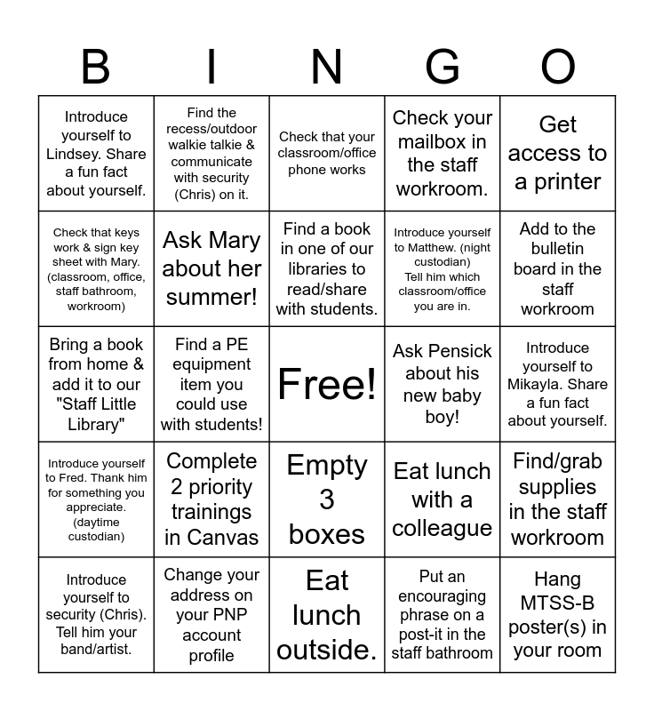 This bingo card has a free space and 24 words: Complete 2 priority trainings in Canvas, Change your address on your PNP account profile, Find a book in one of our libraries to read/share with students., Introduce yourself to security (Chris). Tell him your band/artist., Get access to a printer, Introduce yourself to Lindsey. Share a fun fact about yourself., Check that keys work & sign key sheet with Mary. (classroom, office, staff bathroom, workroom), Find the recess/outdoor walkie talkie & communicate with security (Chris) on it., Ask Pensick about his new baby boy!, Empty 3 boxes, Introduce yourself to Matthew. (night custodian) Tell him which classroom/office you are in., Bring a book from home & add it to our "Staff Little Library", Eat lunch with a colleague, Find/grab supplies in the staff workroom, Ask Mary about her summer!, Put an encouraging phrase on a post-it in the staff bathroom, Introduce yourself to Mikayla. Share a fun fact about yourself., Check that your classroom/office phone works, Add to the bulletin board in the staff workroom, Find a PE equipment item you could use with students!, Hang MTSS-B poster(s) in your room, Introduce yourself to Fred. Thank him for something you appreciate. (daytime custodian), Check your mailbox in the staff workroom. and Eat lunch outside..