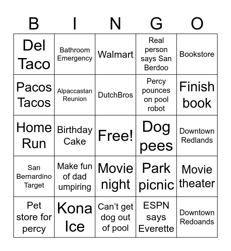 This bingo card has a free space and 24 words: Make fun of dad umpiring, Kona Ice, DutchBros, Pet store for percy, Bookstore, Del Taco, Pacos Tacos, Bathroom Emergency, Dog pees, Movie night, Percy pounces on pool robot, Home Run, Park picnic, Movie theater, Alpaccastan Reunion, ESPN says Everette, Downtown Redlands, Walmart, Finish book, Birthday Cake, Downtown Redoands, San Bernardino Target, Real person says San Berdoo and Can’t get dog out of pool.