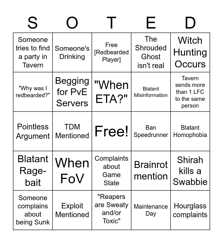 This bingo card has a free space and 24 words: When FoV, Exploit Mentioned, "When ETA?", Someone complains about being Sunk, Witch Hunting Occurs, Someone tries to find a party in Tavern, "Why was I redbearded?", Someone's Drinking, Ban Speedrunner, Complaints about Game State, Blatant Misinformation, Pointless Argument, Brainrot mention, Shirah kills a Swabbie, Begging for PvE Servers, Maintenance Day, Blatant Homophobia, Free [Redbearded Player], Tavern sends more than 1 LFC to the same person, TDM Mentioned, Hourglass complaints, Blatant Rage-bait, The Shrouded Ghost isn't real and "Reapers are Sweaty and/or Toxic".