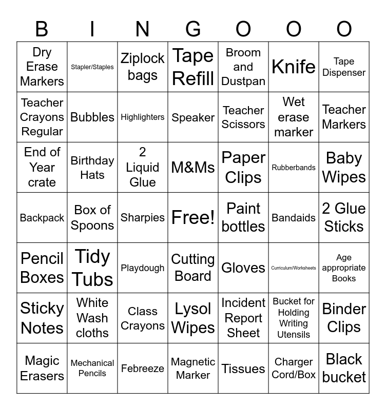 This bingo card has a free space and 48 words: Incident Report Sheet, Wet erase marker, Magnetic Marker, Box of Spoons, 2 Liquid Glue, 2 Glue Sticks, Stapler/Staples, Mechanical Pencils, Knife, Cutting Board, Tape Dispenser, Tape Refill, Rubberbands, Paper Clips, Sticky Notes, Bandaids, Teacher Crayons Regular, Teacher Markers, Bucket for Holding Writing Utensils, Broom and Dustpan, Teacher Scissors, Sharpies, Dry Erase Markers, Bubbles, Binder Clips, Highlighters, Baby Wipes, Magic Erasers, M&Ms, Birthday Hats, Charger Cord/Box, Paint bottles, Age appropriate Books, White Wash cloths, Backpack, Gloves, Curriculum/Worksheets, End of Year crate, Playdough, Class Crayons, Pencil Boxes, Black bucket, Ziplock bags, Febreeze, Speaker, Lysol Wipes, Tidy Tubs and Tissues.