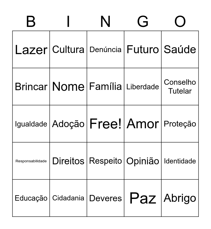 This bingo card has a free space and 25 words: Direitos, Deveres, Família, Educação, Saúde, Lazer, Brincar, Cultura, Amor, Respeito, Liberdade, Igualdade, Opinião, Identidade, Nome, Justiça, Proteção, Denúncia, Conselho Tutelar, Adoção, Abrigo, Cidadania, Responsabilidade, Futuro and Paz.