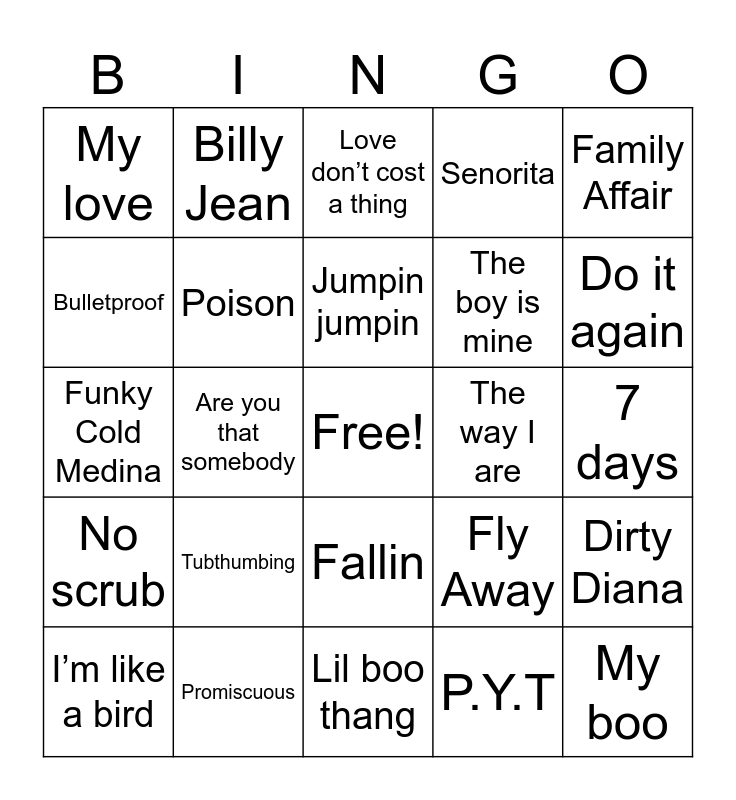 This bingo card has a free space and 58 words: Rock your body, Promiscuous, The sweet escape, No scrub, P.Y.T, Remember the Time, Poison, Hit em up style, The boy is mine, Rock with you, Senorita, SOS, Maria Maria, Doo wop, No Diggity, My love, My boo, Family Affair, Say my name, Jumpin jumpin, The way I are, Love don’t cost a thing, I’m like a bird, Dirty Diana, Finesse, 7 days, It’s not right but it’s okay, Caught up, Do it again, Fight for your right, It’s tricky, Sabotage, Girls, Mo money mo problems, Insane in the brain, Whoomp there it is, Here comes the hotstepper, Are you that somebody, Funky Cold Medina, California love, Tubthumbing, Rhythm is a Dancer, Fly Away, Fireball, Dance Again, Shake senora, Womanizer, Fallin, Lil boo thang, Houdini, These words, Get busy, Move your feet, Crazy, Billy Jean, Don’t phunk with my heart, Bulletproof and Bright lights bigger city.