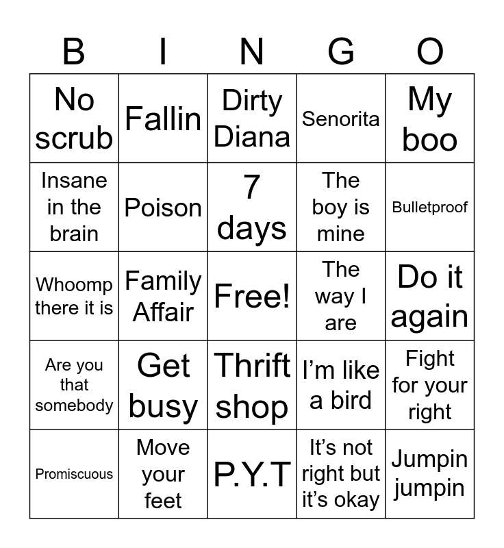This bingo card has a free space and 55 words: Rock your body, Promiscuous, The sweet escape, No scrub, P.Y.T, Remember the Time, Poison, Hit em up style, The boy is mine, Rock with you, Senorita, SOS, Maria Maria, Doo wop, No Diggity, My love, My boo, Family Affair, Say my name, Jumpin jumpin, The way I are, Love don’t cost a thing, I’m like a bird, Dirty Diana, Finesse, 7 days, It’s not right but it’s okay, Caught up, Do it again, Fight for your right, It’s tricky, Sabotage, Girls, Mo money mo problems, Insane in the brain, Whoomp there it is, Here comes the hotstepper, Are you that somebody, Shake senora, Womanizer, Fallin, Lil boo thang, Houdini, These words, Get busy, Move your feet, Crazy, Billy Jean, Don’t phunk with my heart, Bulletproof, Bright lights bigger city, The rhythm of the night, Killing me softly with his song, Thrift shop and It’s a beautiful day.