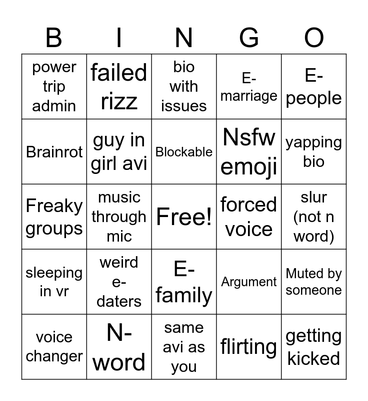 This bingo card has a free space and 29 words: voice changer, Nsfw, music through mic, white knight, power trip admin, bio with issues, guy in girl avi, weird e-daters, forced voice, N-word, slur (not n word), getting kicked, same avi as you, flirting, yapping bio, meeting mute, E-family, sleeping in vr, E-people, Freaky groups, Argument, Drama, Nsfw emoji, Brainrot, E-marriage, failed rizz, Muted by someone, Blockable and Phantom anything.