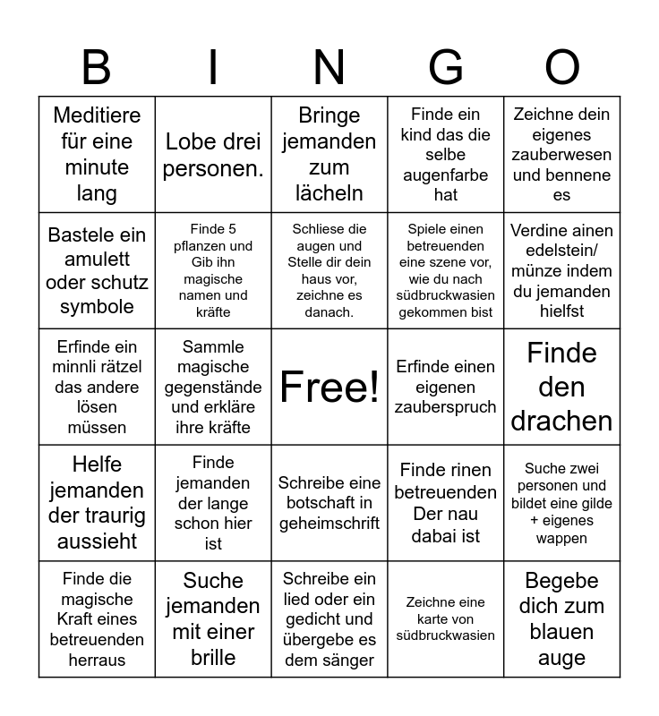 This bingo card has a free space and 24 words: Finde jemanden der lange schon hier ist, Suche jemanden mit einer brille, Schliese die augen und Stelle dir dein haus vor, zeichne es danach., Finde die magische Kraft eines betreuenden herraus, Zeichne dein eigenes zauberwesen und bennene es, Meditiere für eine minute lang, Bastele ein amulett oder schutz symbole, Lobe drei personen., Erfinde einen eigenen zauberspruch, Schreibe eine botschaft in geheimschrift, Spiele einen betreuenden eine szene vor, wie du nach südbruckwasien gekommen bist, Erfinde ein minnli rätzel das andere lösen müssen, Finde rinen betreuenden Der nau dabai ist, Suche zwei personen und bildet eine gilde + eigenes wappen, Finde 5 pflanzen und Gib ihn magische namen und kräfte, Zeichne eine karte von südbruckwasien, Finde den drachen, Bringe jemanden zum lächeln, Verdine ainen edelstein/ münze indem du jemanden hielfst, Sammle magische gegenstände und erkläre ihre kräfte, Begebe dich zum blauen auge, Helfe jemanden der traurig aussieht, Finde ein kind das die selbe augenfarbe hat and Schreibe ein lied oder ein gedicht und übergebe es dem sänger.