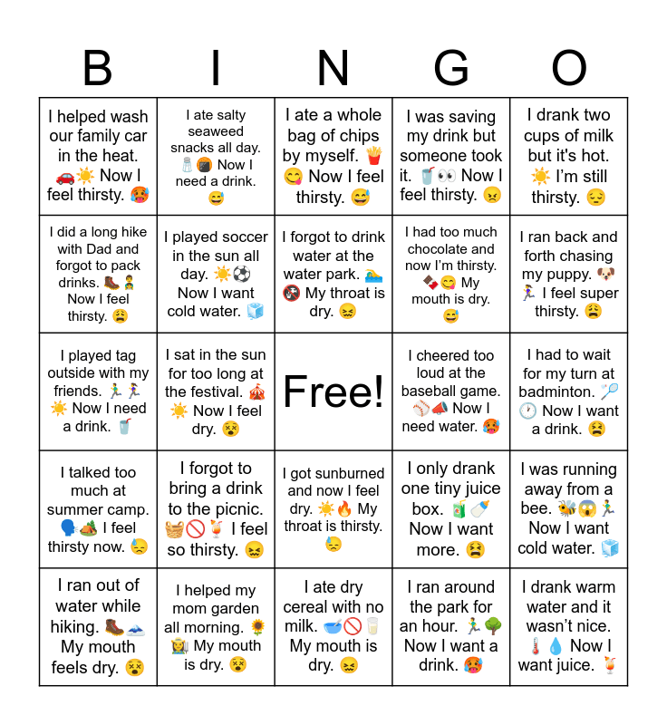 This bingo card has a free space and 34 words: I forgot my water bottle on the school trip. π«π«π₯€ I feel thirsty. π©, I ran around the park for an hour. πββοΈπ³ Now I want a drink. π₯΅, I ate spicy tteokbokki for lunch. πΆοΈπ½οΈ My mouth is so dry. π, I had one sip of soda and thatβs it. π₯€π Now Iβm super thirsty. π«, I talked too much at summer camp. π£οΈποΈ I feel thirsty now. π, I played soccer in the sun all day. βοΈβ½ Now I want cold water. π§, I drank two cups of milk but it's hot. βοΈ Iβm still thirsty. π, I ran out of water while hiking. π₯Ύπ» My mouth feels dry. π΅, I ate salty seaweed snacks all day. π§π Now I need a drink. π , I danced to K-pop for two hours. ππΆ Now I feel so thirsty. π«, I forgot to drink water at the water park. πββοΈπ± My throat is dry. π, I ate a whole bag of chips by myself. ππ Now I feel thirsty. π , I drank milk but now I want juice. π₯π My mouth is still dry. π, I was too shy to ask for a drink. ππ§ Now I feel thirsty. π, I cheered too loud at the baseball game. βΎπ£ Now I need water. π₯΅, I ran back and forth chasing my puppy. πΆπββοΈ I feel super thirsty. π©, I helped my mom garden all morning. π»π©βπΎ My mouth is dry. π΅, I played tag outside with my friends. πββοΈπββοΈβοΈ Now I need a drink. π₯€, I forgot to bring a drink to the picnic. π§Ίπ«πΉ I feel so thirsty. π, I only drank one tiny juice box. π§πΌ Now I want more. π«, I got sunburned and now I feel dry. βοΈπ₯ My throat is thirsty. π, I rode my bike around Cheongna Lake Park in the sun. π΄ββοΈπ I need cold water. π§, I helped wash our family car in the heat. πβοΈ Now I feel thirsty. π₯΅, I had to wait for my turn at badminton. πΈπ Now I want a drink. π«, I ate dry cereal with no milk. π₯£π«π₯ My mouth is dry. π, I drank warm water and it wasnβt nice. π‘οΈπ§ Now I want juice. πΉ, I was saving my drink but someone took it. π₯€π Now I feel thirsty. π , I spilled my grape juice on the floor. ππ§π’ Now I want another one. π, I had too much chocolate and now Iβm thirsty. π«π My mouth is dry. π , I did a long hike with Dad and forgot to pack drinks. π₯Ύπ¨βπ§ Now I feel thirsty. π©, I only drank one sip and my brother drank the rest. π§π¦ Now I need a drink. π€, I sat in the sun for too long at the festival. πͺβοΈ Now I feel dry. π΅, I was running away from a bee. ππ±πββοΈ Now I want cold water. π§ and I ate too much kimchi. π₯¬πΆοΈ Now my mouth is so thirsty. π .