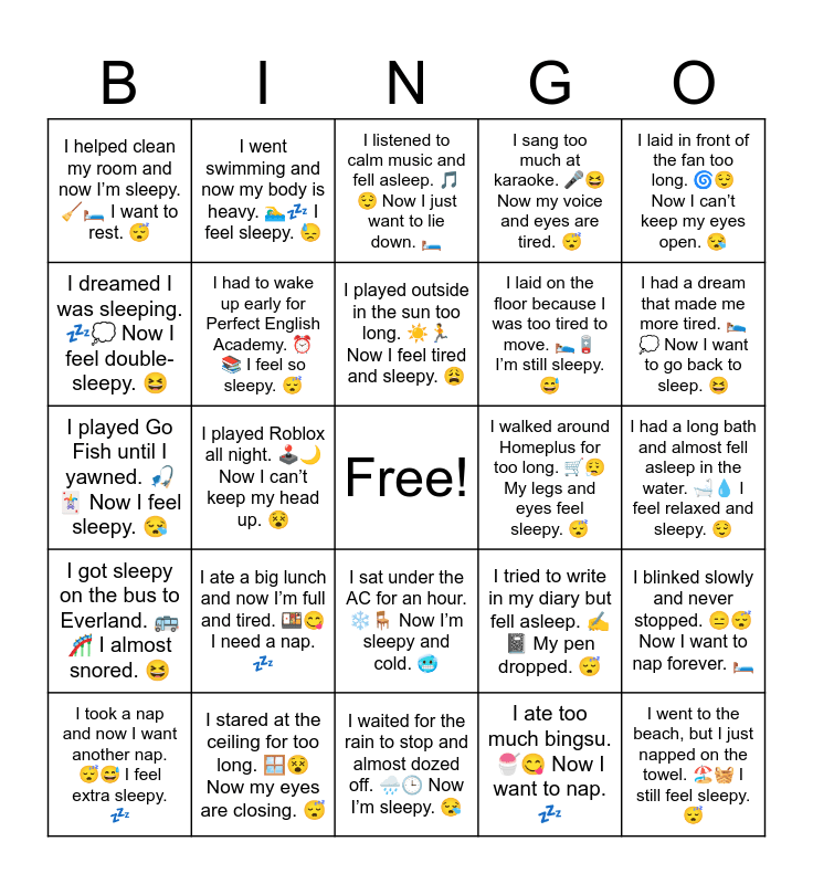 This bingo card has a free space and 34 words: I stayed up too late watching cartoons. ๐บ๐ I feel sleepy. ๐ด, I ate too much bingsu. ๐ง๐ Now I want to nap. ๐ค, I read a book in bed and fell asleep. ๐๐๏ธ My eyes are still closing. ๐ช, I played games all night. ๐ฎ๐ Now Iโm super sleepy. ๐ต, I got sleepy on the bus to Everland. ๐๐ข I almost snored. ๐, I had to wake up early for Perfect English Academy. โฐ๐ I feel so sleepy. ๐ด, I laid in front of the fan too long. ๐๐ Now I canโt keep my eyes open. ๐ช, I took a nap and now I want another nap. ๐ด๐ I feel extra sleepy. ๐ค, I went swimming and now my body is heavy. ๐โโ๏ธ๐ค I feel sleepy. ๐, I watched a boring movie with my parents. ๐ฌ๐ My eyes started closing. ๐ด, I played outside in the sun too long. โ๏ธ๐ Now I feel tired and sleepy. ๐ฉ, I listened to calm music and fell asleep. ๐ต๐ Now I just want to lie down. ๐๏ธ, I waited in line for one hour and almost fell asleep. ๐๐ต I feel sleepy now. ๐ซ, I helped my grandma cook and now Iโm tired. ๐ต๐ณ I want to nap. ๐ค, I walked around Homeplus for too long. ๐๐ฎโ๐จ My legs and eyes feel sleepy. ๐ด, I had a dream that made me more tired. ๐๐ญ Now I want to go back to sleep. ๐, I stared at the ceiling for too long. ๐ช๐ต Now my eyes are closing. ๐ด, I played Go Fish until I yawned. ๐ฃ๐ Now I feel sleepy. ๐ช, I ate a big lunch and now Iโm full and tired. ๐ฑ๐ I need a nap. ๐ค, I tried to write in my diary but fell asleep. โ๏ธ๐ My pen dropped. ๐ด, I sat under the AC for an hour. โ๏ธ๐ช Now Iโm sleepy and cold. ๐ฅถ, I laid on the couch and didnโt get up. ๐๏ธ๐ถ Now I feel like a sleepy potato. ๐ฅ, I helped clean my room and now Iโm sleepy. ๐งน๐๏ธ I want to rest. ๐ด, I had a long bath and almost fell asleep in the water. ๐๐ง I feel relaxed and sleepy. ๐, I waited for the rain to stop and almost dozed off. ๐ง๏ธ๐ Now Iโm sleepy. ๐ช, I went to the beach, but I just napped on the towel. ๐๏ธ๐งบ I still feel sleepy. ๐ด, I sang too much at karaoke. ๐ค๐ Now my voice and eyes are tired. ๐ด, I tried to finish a puzzle, but I got sleepy. ๐งฉ๐ต Now I want a pillow. ๐ค, I laid on the floor because I was too tired to move. ๐๐ชซ Iโm still sleepy. ๐ , I dreamed I was sleeping. ๐ค๐ญ Now I feel double-sleepy. ๐, I stayed up to see the stars but couldnโt stay awake. ๐๐ Now Iโm so tired. ๐ด, I played Roblox all night. ๐น๏ธ๐ Now I canโt keep my head up. ๐ต, I blinked slowly and never stopped. ๐๐ด Now I want to nap forever. ๐๏ธ and I told myself, โDonโt sleep,โ and then I fell asleep. ๐คโก๏ธ๐ด I feel sleepy again. ๐ .