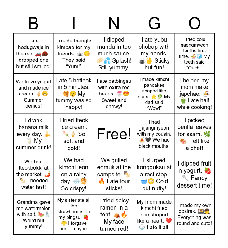 This bingo card has a free space and 34 words: I ate injulmi bingsu and got brain freeze. βοΈ Brrr! So delicious!, My mom made kimchi fried rice shaped like a heart. β€οΈπ I ate it all!, We grilled samgyeopsal outside. π₯π₯ It smelled amazing!, I drank ice-cold sikhye. πΆπ§ Sweet and chilly!, We had tteokbokki at the market. πΆοΈπ’ I needed water fast!, I ate 5 hotteok in 5 minutes. π₯π² My tummy was so happy!, I tried cold naengmyeon for the first time. ππ§ My teeth said βOuch!β, Grandma gave me watermelon with salt. ππ§ Weird but yummy!, I made triangle kimbap for my friends. ππ They said βYum!β, We had chimaek by the lake. ππΊ (But I had soda!), I ate patbingsu with extra red beans. π§π Sweet and chewy!, I dipped mandu in too much sauce. π₯π¦ Splash! Still yummy!, I tried galbi and licked my fingers. ππ Too good to stop!, We made gimbap and had a picnic. π₯¬π± I ate six rolls!, I had jjajangmyeon with my cousin. ππ€ We had black mouths!, I helped my mom make japchae. ππ« I ate half while cooking!, My sister ate all the strawberries on my bingsu. ππ€ I forgave herβ¦ maybe., I drank banana milk every day. ππ₯ My summer drink!, We had kimchi jeon on a rainy day. π§οΈπ₯ So crispy!, I slurped kongguksu at a rest stop. π₯£π³ Cold but nutty!, We grilled eomuk at the campsite. π’π₯ I ate four sticks!, I found honey butter chips at the beach. ποΈπ― So crunchy!, I ate hodugwaja in the car. ππ° I dropped one but still smiled!, I picked perilla leaves for ssam. πΏπ I felt like a chef!, I tried spicy ramen in a tent. βΊπ₯ My face turned red!, I made my own dosirak. π±π§ Everything was round and cute!, I ate yubu chobap with my hands. πποΈ Sticky but fun!, We shared a huge watermelon. ππ I ate the most!, I made kimchi pancakes shaped like stars. βπ₯¬ My dad said βWow!β, We froze yogurt and made ice cream. π¦π Summer genius!, I bought bungeoppang in the heat. ππ₯ Still yummy even hot!, I tried tteok ice cream. π‘π¦ So soft and cold!, I dipped fruit in yogurt. ππ₯ Fancy dessert time! and I ate too much and rolled on the floor. π½οΈπ Summer piggy!.