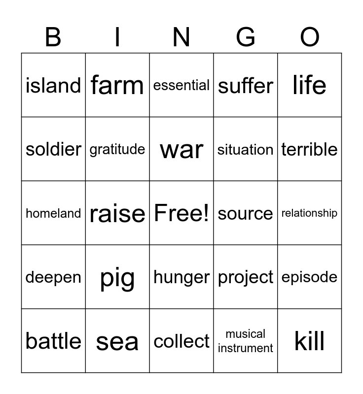 This bingo card has a free space and 24 words: pig, sea, war, battle, life, island, soldier, farm, source, hunger, situation, homeland, project, episode, gratitude, musical instrument, relationship, essential, terrible, raise, kill, deepen, suffer and collect.