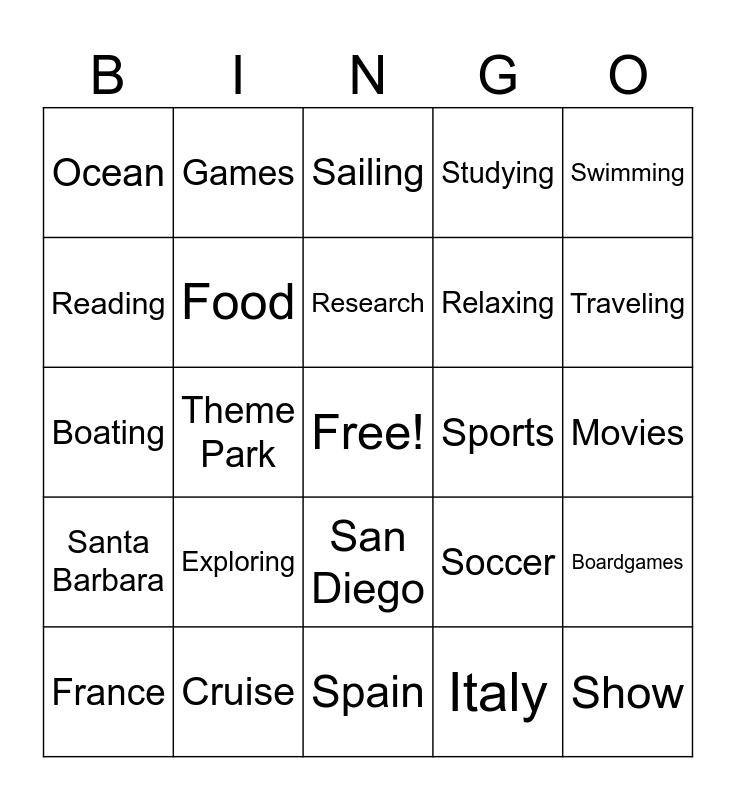This bingo card has a free space and 29 words: France, Tahoe, Theme Park, Camping, Ocean, Sailing, Food, Exploring, Sports, Cruise, Movies, Show, Spain, Italy, Traveling, LA, San Diego, Santa Barbara, Swimming, Boating, Soccer, Baseball, Relaxing, Reading, Studying, Games, Boardgames, Research and Sleeping.