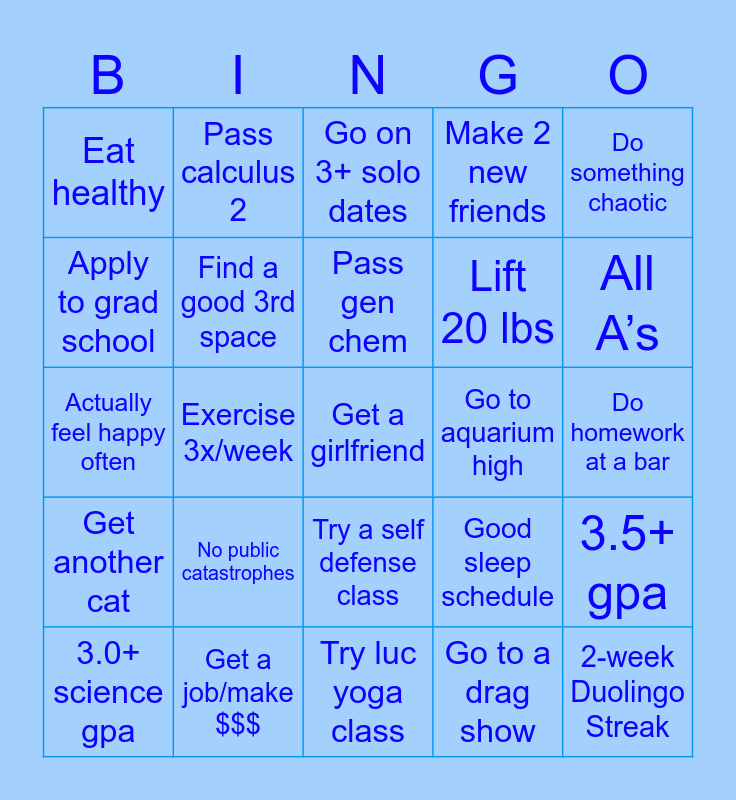 This bingo card has a free space and 24 words: 3.0+ science gpa, No public catastrophes, Pass gen chem, Go to a drag show, Do something chaotic, Eat healthy, Pass calculus 2, Go on 3+ solo dates, Go to aquarium high, Do homework at a bar, Actually feel happy often, Find a good 3rd space, Good sleep schedule, 3.5+ gpa, Apply to grad school, Get a job/make $$$, Try luc yoga class, Make 2 new friends, All A’s, Get another cat, Exercise 3x/week, Try a self defense class, Lift 20 lbs and 2-week Duolingo Streak.