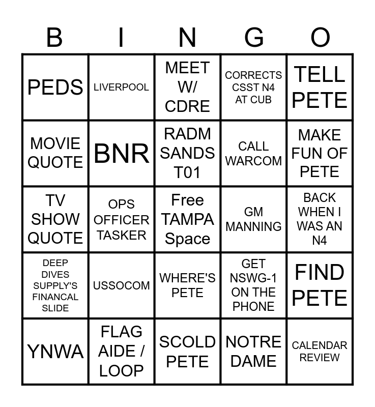 This bingo card has a free space and 24 words: USSOCOM, FLAG AIDE / LOOP, RADM SANDS T01, YNWA, TELL PETE, PEDS, MOVIE QUOTE, LIVERPOOL, GM MANNING, WHERE'S PETE, CALL WARCOM, TV SHOW QUOTE, GET NSWG-1 ON THE PHONE, FIND PETE, BNR, NOTRE DAME, BACK WHEN I WAS AN N4, MEET W/ CDRE, MAKE FUN OF PETE, OPS OFFICER TASKER, CALENDAR REVIEW, DEEP DIVES SUPPLY'S FINANCAL SLIDE, CORRECTS CSST N4 AT CUB and SCOLD PETE.