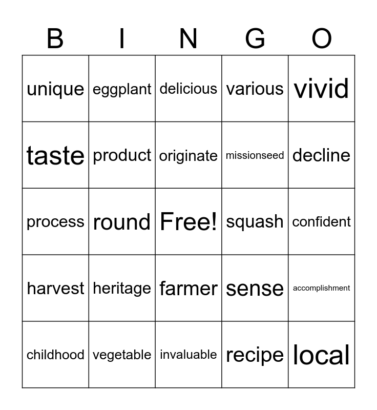 This bingo card has a free space and 24 words: heritage, vegetable, originate, childhood, vivid, unique, taste, eggplant, squash, farmer, missionseed, process, sense, accomplishment, product, recipe, confident, delicious, decline, round, local, harvest, various and invaluable.
