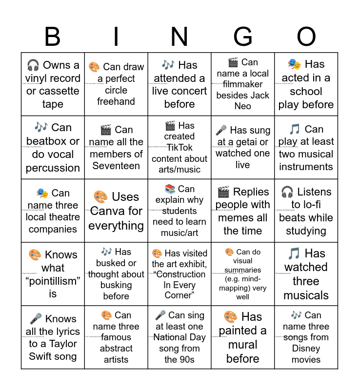 This bingo card has 24 images, a free space and 24 words: 🎶 Has busked or thought about busking before, 🎨 Can name three famous abstract artists, 🎬 Has created TikTok content about arts/music, 🎤 Knows all the lyrics to a Taylor Swift song, 🎭 Has acted in a school play before, 🎧 Owns a vinyl record or cassette tape, 🎶 Can beatbox or do vocal percussion, 🎨 Can draw a perfect circle freehand, 🎬 Replies people with memes all the time, 🎨 Has visited the art exhibit, “Construction In Every Corner”, 🎤 Has sung at a getai or watched one live, 🎭 Can name three local theatre companies, 🎨 Can do visual summaries (e.g. mind-mapping) very well, 🎵 Has watched three musicals, 🎬 Can name all the members of Seventeen, 🎨 Has painted a mural before, 🎧 Listens to lo-fi beats while studying, 🎶 Has attended a live concert before, 🎵 Can play at least two musical instruments, 🎨 Uses Canva for everything, 🎶 Can name three songs from Disney movies, 🎨 Knows what “pointillism” is, 🎬 Can name a local filmmaker besides Jack Neo and 🎤 Can sing at least one National Day song from the 90s.