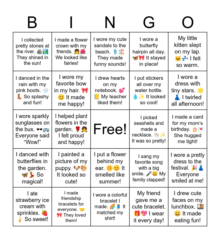 This bingo card has a free space and 34 words: I wore a pink hat to the park. ๐๐ณ I felt like a princess. ๐, My friend gave me a cute bracelet. ๐๐ I wear it every day!, I picked tiny flowers for my mom. ๐ธ๐ผ She smiled so big!, I painted my nails bright pink. ๐ ๐จ They look like candy!, I danced with butterflies in the garden. ๐ฆ๐ So magical!, I wore my favorite bow in my hair. ๐๐ It made me happy!, My little kitten slept on my lap. ๐ฑ๐ค I felt so warm., I ate strawberry ice cream with sprinkles. ๐๐ฆ So sweet!, I made a flower crown with my friends. ๐ง๐บ We looked like fairies!, I found a ladybug on my hand. ๐๐ฎ It stayed all day!, I drew hearts on my notebook. ๐๐ My teacher liked them!, I wore my cute sandals to the beach. ๐ฉด๐๏ธ They made funny sounds!, I took pictures with my teddy bear. ๐งธ๐ธ We smiled together!, I wore a shiny necklace from Grandma. ๐๐ต I felt special., I picked seashells and made a necklace. ๐โจ It was so pretty!, I wore a dress with tiny stars. ๐๐ I twirled all afternoon!, I made friendship bracelets for everyone. ๐ค๐ They loved them!, I wore sparkly sunglasses on the bus. ๐ถ๏ธ๐ Everyone said โWow!โ, I painted a picture of my puppy. ๐ถ๐จ It looked so cute!, I sang my favorite song with a big smile. ๐ค๐ My family clapped!, I put a flower behind my ear. ๐ผ๐ It smelled like summer!, I wore matching socks with my best friend. ๐งฆ๐ญ We felt like twins!, I collected pretty stones at the river. ๐ชจ๐๏ธ They shined in the sun!, I made a card for my momโs birthday. ๐๐ She hugged me tight!, I wore a colorful bracelet I made. ๐๐งต It matched my shirt!, I drew cute faces on my lunchbox. ๐ฑ๐ It made eating fun!, I wore a butterfly hairpin all day. ๐ฆ๐ It stayed in place!, I had a picnic with my dolls. ๐งบ๐งธ We shared cookies!, I put stickers all over my water bottle. ๐งโจ It looked so cool!, I danced in the rain with my pink boots. ๐ง๏ธ๐ข So splashy and fun!, I made a paper fan with pretty designs. ๐๐๏ธ It kept me cool!, I helped plant flowers in the garden. ๐น๐ง I felt proud and happy!, I wore a pretty dress to the festival. ๐๐ Everyone smiled at me! and I tied ribbons on my bicycle. ๐ฒ๐ It looked like a princessโs ride.