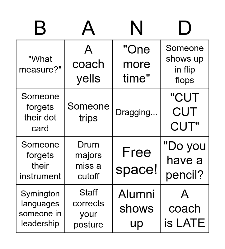 This bingo card has 16 words: Staff corrects your posture, "Do you have a pencil?, "One more time", "What measure?", Someone forgets their instrument, A coach yells, Free space!, Alumni shows up, Someone forgets their dot card, Someone trips, Symington languages someone in leadership, Someone shows up in flip flops, Drum majors miss a cutoff, "CUT CUT CUT", Dragging... and A coach is LATE.