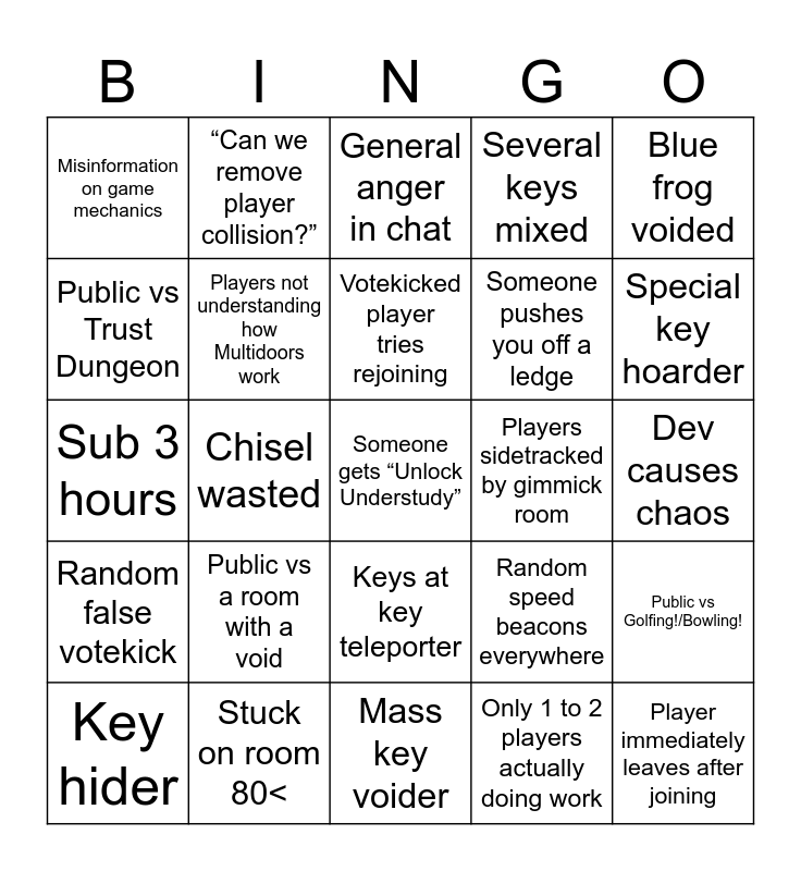 This bingo card has a free space and 33 words: “Can we form a line?”, Skeleton key wasted, Chisel wasted, “LET ME PUT MY KEY IN!”, Random false votekick, Players not understanding how Multidoors work, Blue frog voided, Key hider, “Can we remove player collision?”, Votekicked player joins on an alt, Votekicked player tries rejoining, General anger in chat, Key hidden in door, Keys 4+ rooms behind, Players sidetracked by gimmick room, Special key hoarder, Stuck on room 80<, Sub 3 hours, Public vs a room with a void, Random speed beacons everywhere, Keys at key teleporter, 3+ skeleton keys used, Misinformation on game mechanics, Dev causes chaos, Mass key voider, Player immediately leaves after joining, Several keys mixed, Someone pushes you off a ledge, Public vs Trust Dungeon, Public vs Golfing!/Bowling!, 2+ hours on room 20>, Only 1 to 2 players actually doing work and Someone gets kicked by automod.