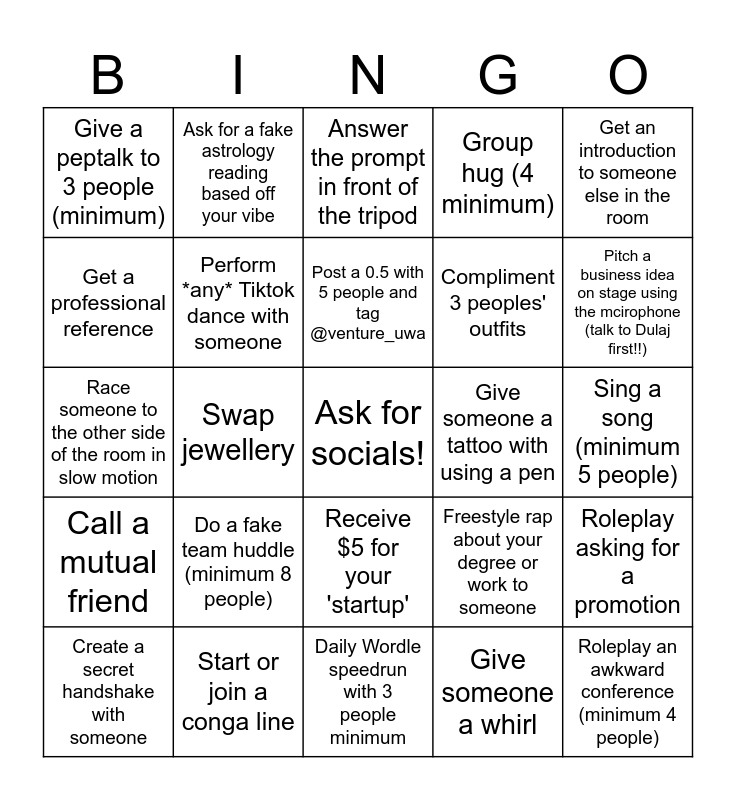 This bingo card has a free space and 24 words: Do a fake team huddle (minimum 8 people), Start or join a conga line, Post a 0.5 with 5 people and tag @venture_uwa, Create a secret handshake with someone, Get an introduction to someone else in the room, Give a peptalk to 3 people (minimum), Get a professional reference, Ask for a fake astrology reading based off your vibe, Give someone a tattoo with using a pen, Receive $5 for your 'startup', Compliment 3 peoples' outfits, Race someone to the other side of the room in slow motion, Freestyle rap about your degree or work to someone, Roleplay asking for a promotion, Perform *any* Tiktok dance with someone, Give someone a whirl, Sing a song (minimum 5 people), Answer the prompt in front of the tripod, Pitch a business idea on stage using the mcirophone (talk to Dulaj first!!), Swap jewellery, Roleplay an awkward conference (minimum 4 people), Call a mutual friend, Group hug (4 minimum) and Daily Wordle speedrun with 3 people minimum.