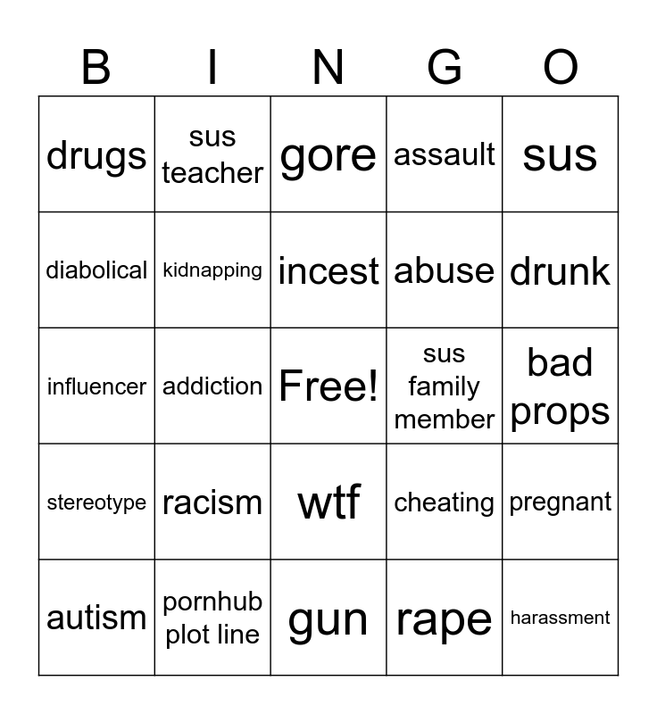This bingo card has a free space and 24 words: racism, pornhub plot line, incest, autism, sus, drugs, diabolical, sus teacher, sus family member, wtf, abuse, influencer, cheating, pregnant, kidnapping, rape, bad props, gore, drunk, addiction, harassment, stereotype, assault and gun.