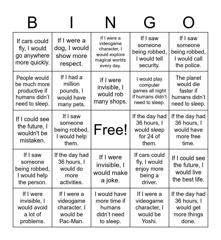 This bingo card has a free space and 39 words: If I had a million pounds, I would travel the world., If I had a million pounds, I would donate half of it., If I had a million pounds, I would buy a flat in London., If I had a million pounds, I would have many pets., If I were invisible, I would avoid a lot of problems., If I were invisible, I would make a joke., If I were invisible, I would rob many shops., If I were invisible, I would go into many places., If I saw someone being robbed, I would call the police., If I saw someone being robbed, I would help the person., If I saw someone being robbed, I would help them., If I saw someone being robbed, I would tell security., If the day had 36 hours, I would get more things done., If the day had 36 hours, I would have more free time., If the day had 36 hours, I would sleep for 24 of them., If the day had 36 hours, I would do more activities., If cars could fly, I would travel much faster., If cars could fly, I would go anywhere more quickly., If cars could fly, I would drive them., If cars could fly, I would enjoy more being a driver., People would be much more productive if humans didn’t need to sleep., I would have more time if humans didn’t need to sleep., I would play computer games all night if humans didn’t need to sleep., The planet would die faster if humans didn’t need to sleep., If I had the power of teletransportation, we would never be late for anything., If I had the power of teletransportation, I would be happy., If I had the power of teletransportation, I would steal a rocket and go to another galaxy., If I had the power of teletransportation,I would travel around the world quickly., If I were a dog, I would spend my day playing in the park., If I were a dog, I would show more respect., If I were a dog, I would eat my owner's shoes., If I were a videogame character, I would be Zeus in Dota 2., If I were a videogame character, I would explore magical worlds every day., If I were a videogame character, I would be Pac-Man., If I were a videogame character, I would be Yoshi., If I could see the future, I would be a cameo in films., If I could see the future, I would live the best life., If I could see the future, I wouldn't be mistaken. and If I could see the future, I would know how I would die, so I would take precautions..