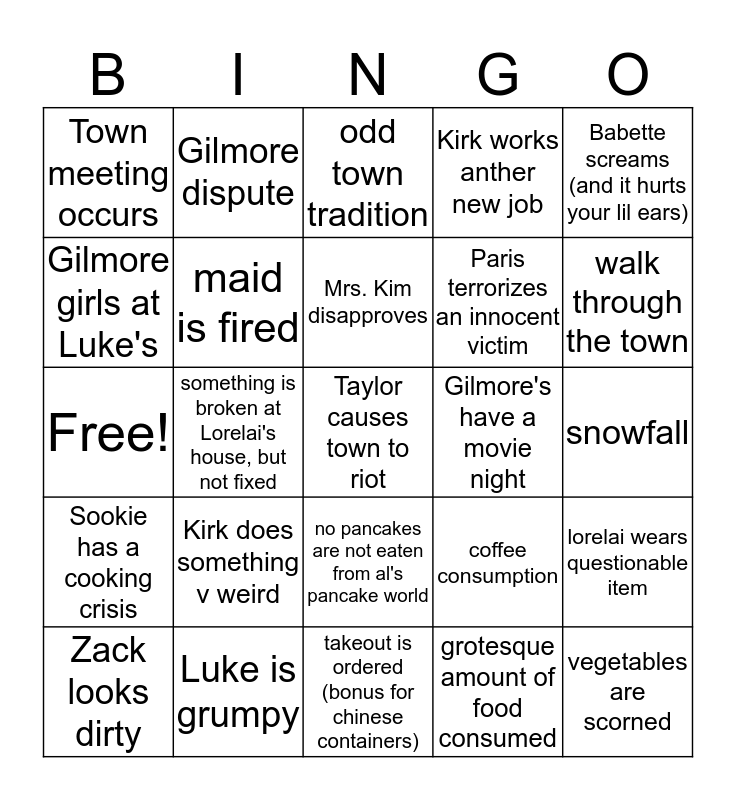 This bingo card has a free space and 24 words: Kirk does something v weird, Luke is grumpy, Mrs. Kim disapproves, Zack looks dirty, Babette screams (and it hurts your lil ears), Town meeting occurs, Gilmore girls at Luke's, Gilmore dispute, Gilmore's have a movie night, no pancakes are not eaten from al's pancake world, Paris terrorizes an innocent victim, Free!, coffee consumption, lorelai wears questionable item, maid is fired, grotesque amount of food consumed, snowfall, odd town tradition, walk through the town, something is broken at Lorelai's house, but not fixed, vegetables are scorned, Sookie has a cooking crisis, Kirk works anther new job and takeout is ordered (bonus for chinese containers).