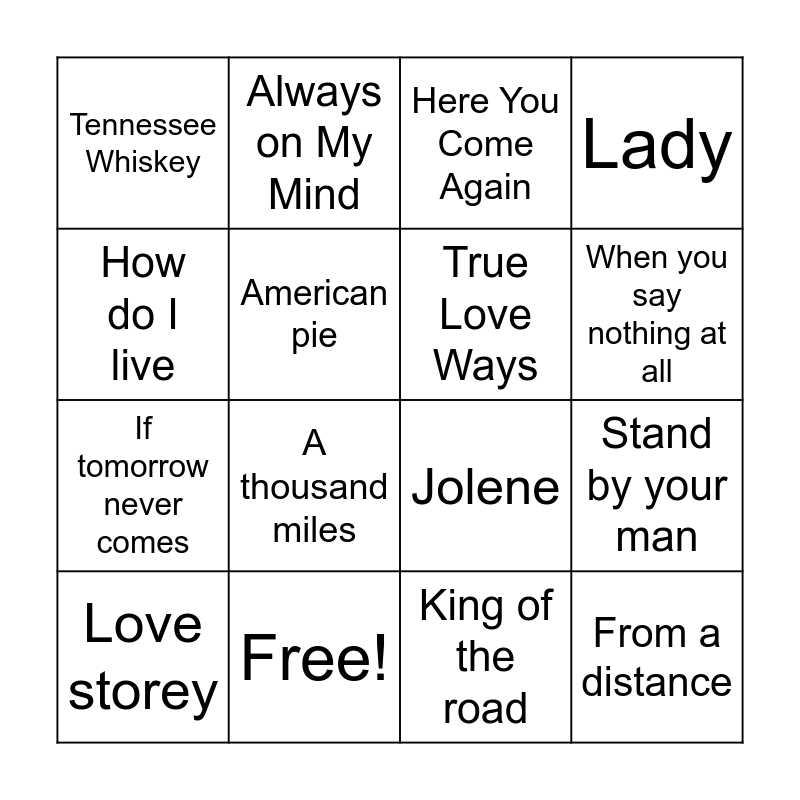 This bingo card has 22 words: Free!, Annie's Song, Always on My Mind, amazed, American pie, True Love Ways, Tennessee Whiskey, Here You Come Again, Jolene, From a distance, If tomorrow never comes, Lady, I Had Some Help, If I Were A Boy, King of the road, You’re Still The One, Stand by your man, Love storey, A thousand miles, How do I live, When you say nothing at all and Sometimes when we touch.
