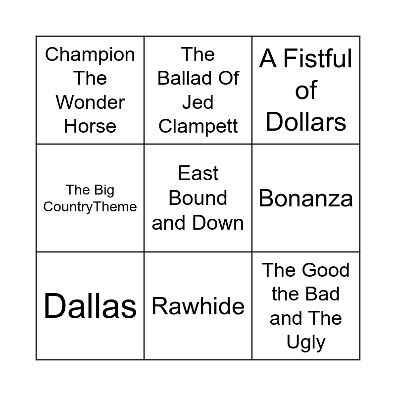This bingo card has 15 words: Convoy, The Magnificent Seven, A Fistful of Dollars, Champion The Wonder Horse, Rawhide, East Bound and Down, Ghost Riders In The Sky, Unknown Stuntman, Bonanza, The Good the Bad and The Ugly, You've Got a Friend in Me, The Big CountryTheme, Dallas, The Ballad Of Jed Clampett and Good Ol Boys.
